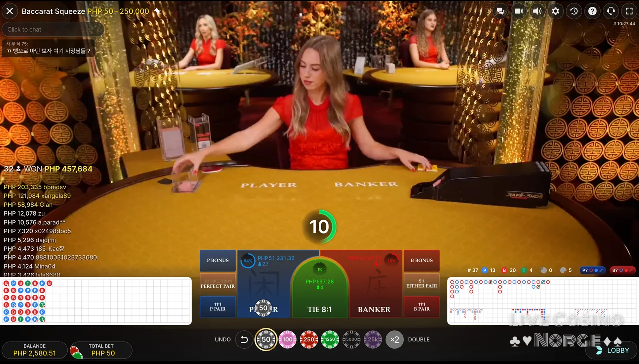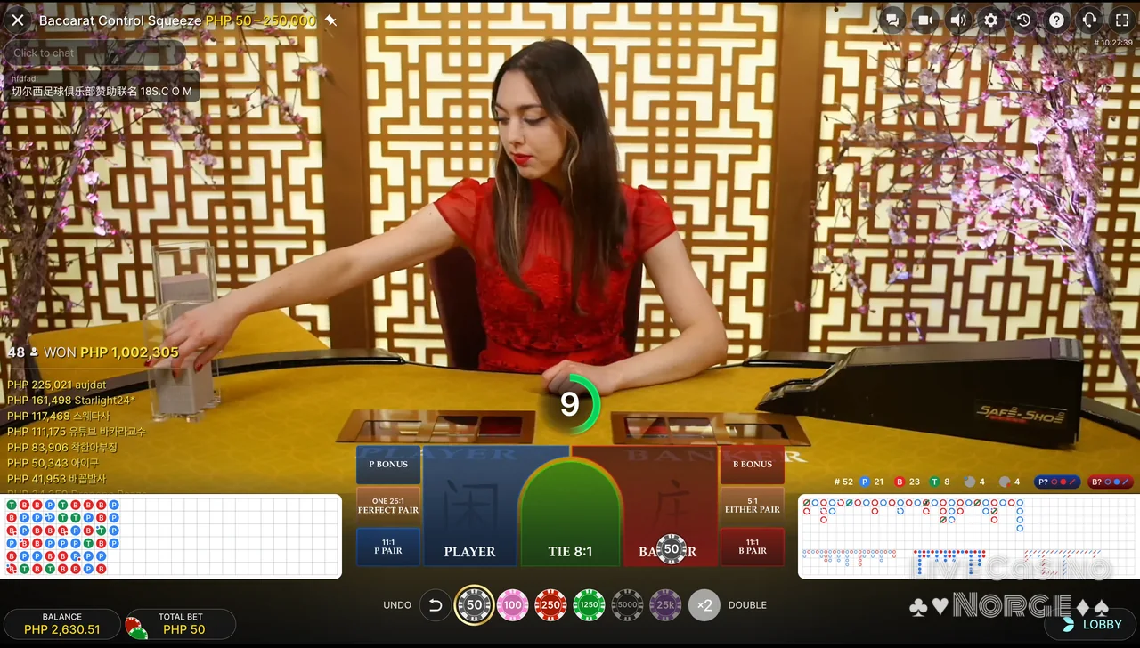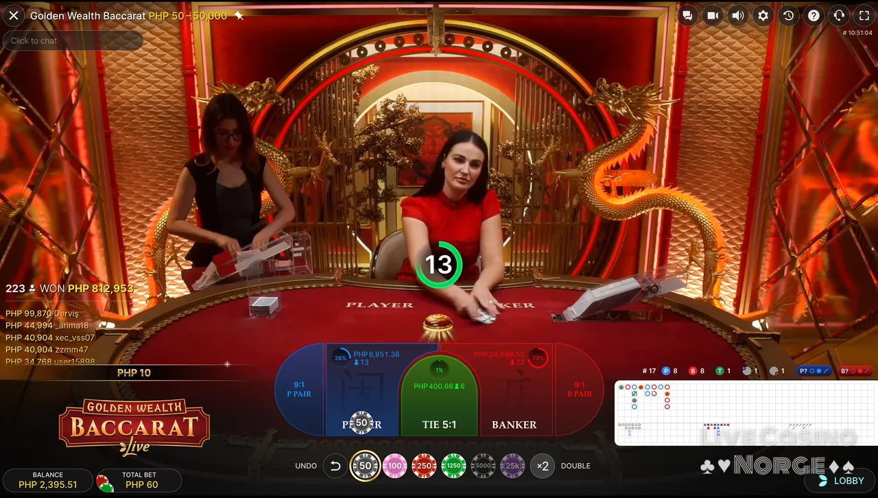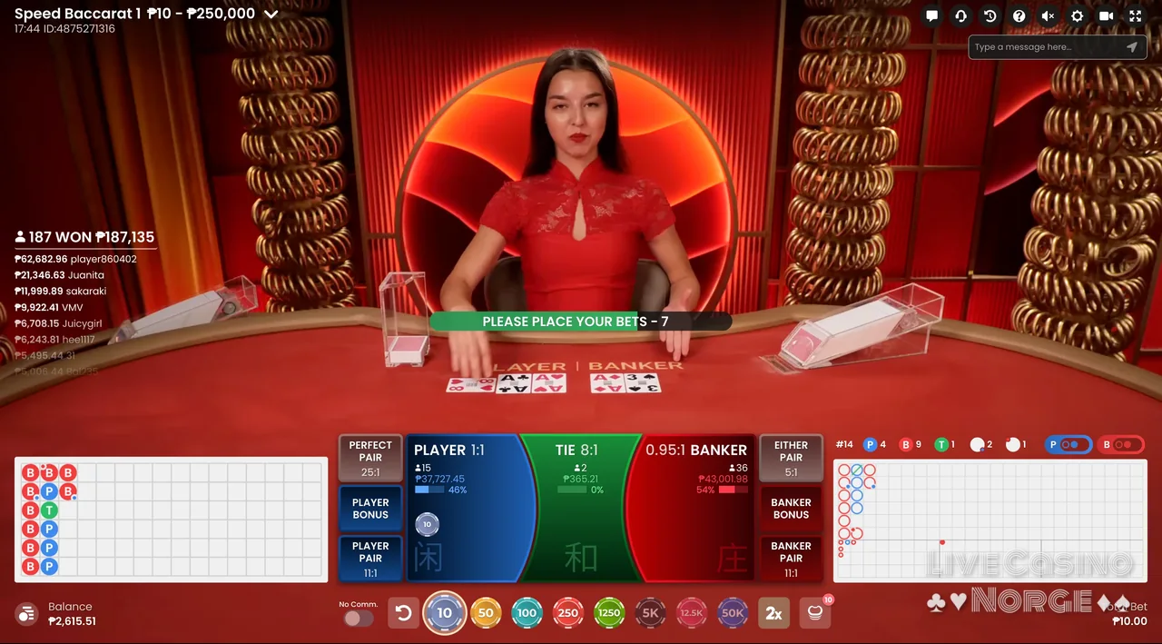 Bet On Baccarat (Playtech): Dette Playtech-tilbudet skiller seg ut takket være det store utvalget av innsatsmuligheter. I Bet On Baccarat kan spillerne plassere 33 ulike innsatser, som alle faller inn under disse kategoriene: Main Hand Bets, Suits and Color, Totals og Egalite. Dette spillet er for spillere som elsker å satse på sidespill for å få ekstra spenning og potensielt høyere utbetalinger.