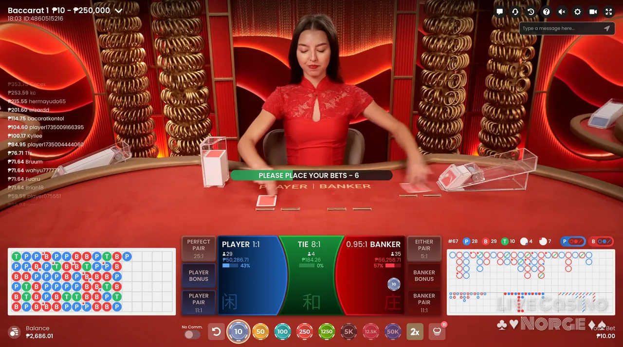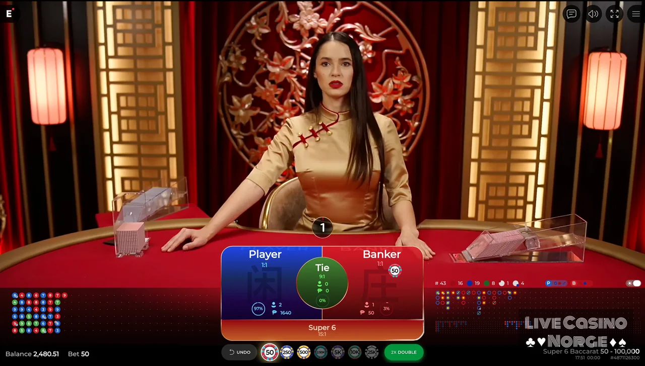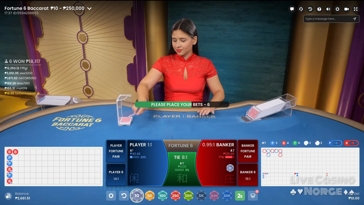 Fortune 6 Baccarat (Pragmatic Play Live): Er et spennende spill som følger de tradisjonelle baccarat-reglene, men som innoverer ved å introdusere fem unike sidespill, nemlig Player or Banker Fortune Pair, Fortune 6, Player 6 og Banker. Dette spillet er populært blant dem som liker å plassere sidespill ved siden av hovedinnsatsen.