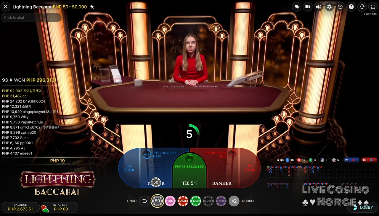 Lightning Baccarat (Evolution Gaming): Er en del av Evolution Gamings populære Lightning-serie, som er en samling live casinospill med de ettertraktede Lightning-multiplikatorene. Lightning Baccarat gir en elektrifiserende vri på klassiske spillet ved å introdusere 2x, 3x, 4x, 5x eller 8x Lightning-multiplikatorer i spillet, noe som gir potensielt større utbetalinger.