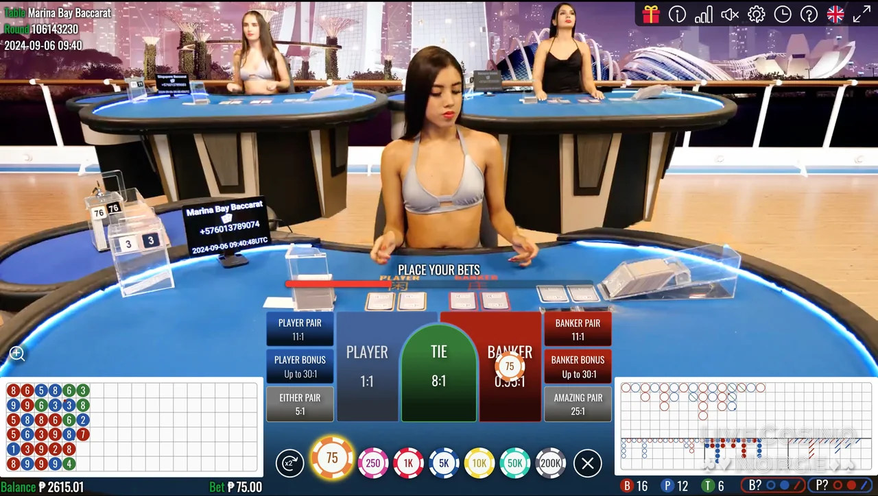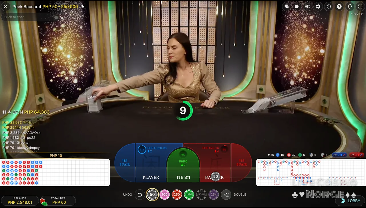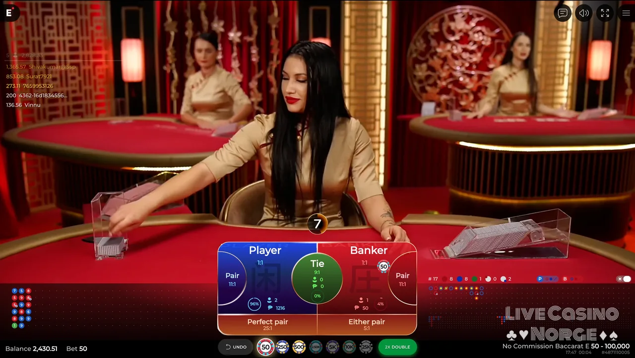 Peek Baccarat (Evolution Gaming): Gir spillerne muligheten til å kikke på noen få kort før de avslutter innsatsen sin, noe som fremhever et strategisk element som ikke finnes i andre versjoner. Den ekstra strategiske muligheten til å kikke på kortene gjør spillet mer interaktivt og engasjerende, og tiltrekker seg spillere som liker taktiske utfordringer.
