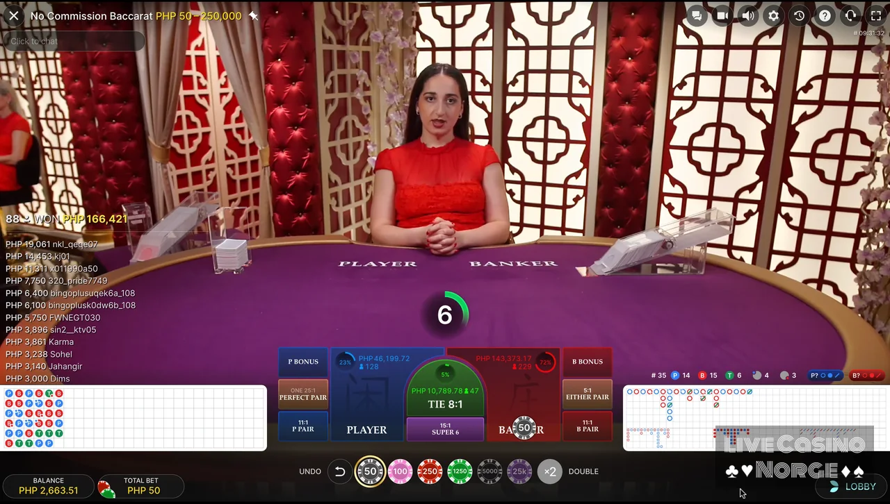 Baccarat uten provisjon (Ezugi): Er en annen populær versjon av live baccarat som mange leverandører vanligvis har i sin portefølje. Dette spillet eliminerer den tradisjonelle provisjonen på 5 % på bankgevinster, og tilbyr en enklere utbetalingsstruktur som appellerer til et bredt publikum. For å kompensere for mangelen på provisjon, betaler en Banker-gevinst med totalt 6 bare 0,5 ganger innsatsen, noe som balanserer husets fordel litt.