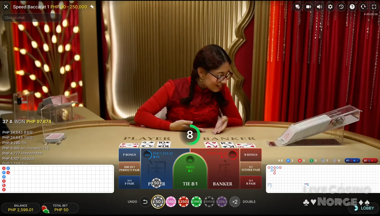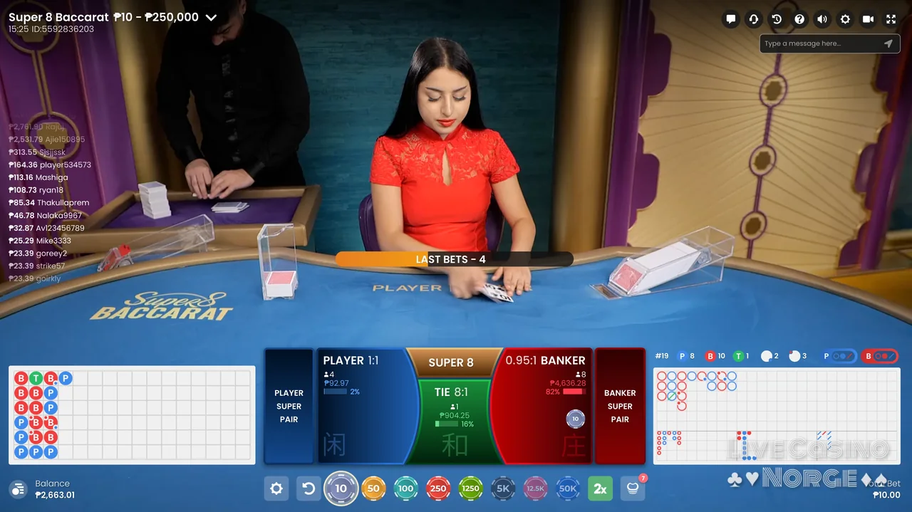 Super 8 Baccarat (Pragmatic Play Live): I likhet med Pragmatic Play Lives Fortune 6, introduserer Super 8 også tre unike sidespill: Super 8-sidespillet, Rød/Svart-sidespillet for spiller og bankør, og Super Pairs-sidespillet for spiller og bankør. De ekstra sidespillene og den unike utbetalingsstrukturen gjør Super 8 mer engasjerende, og gir spillerne ekstra muligheter til å vinne stort.