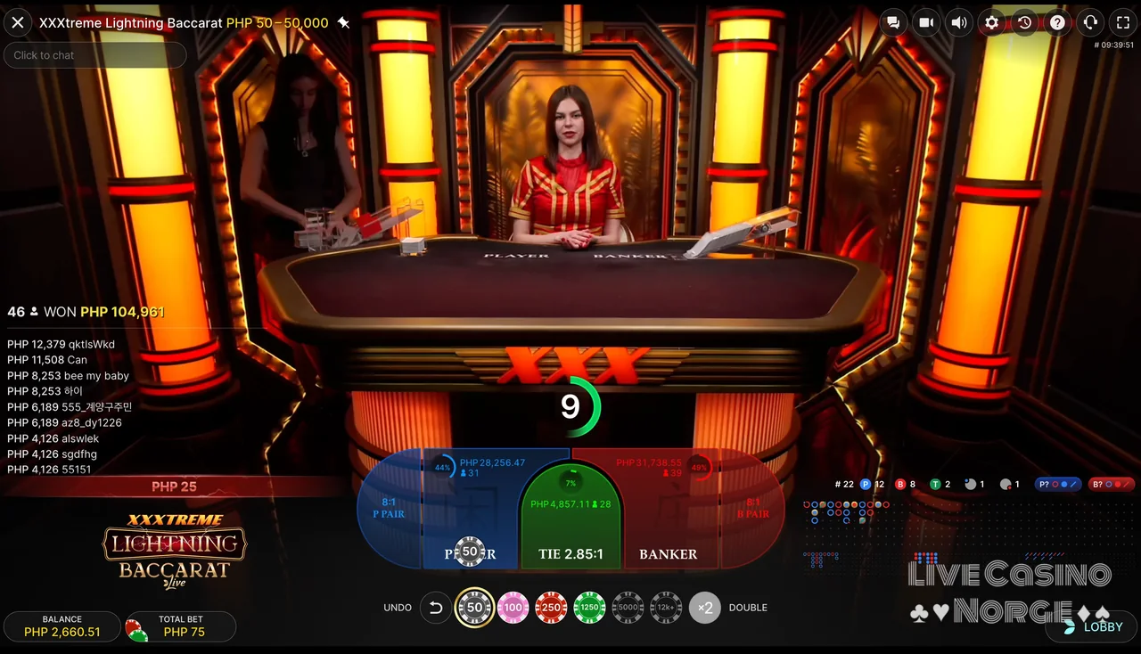 XXXtreme Lightning Baccarat fra Evolution Gaming kombinerer live baccarat med kraftige Lightning-multiplikatorer på utvalgte kort.