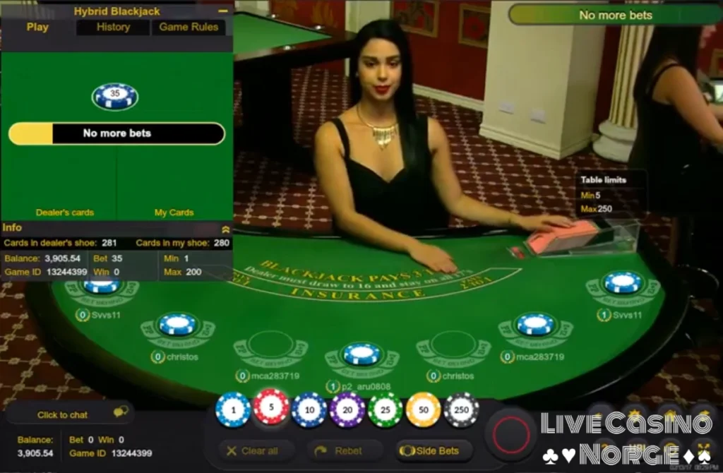 Hybrid Blackjack ser ut og føles som et klassisk live blackjack-spill, både når det gjelder spillstudio, design og grensesnitt. Det som gjør det annerledes, er at selv om det drives av en profesjonell dealer, bruker det også en RNG-motor for kortutdeling.
