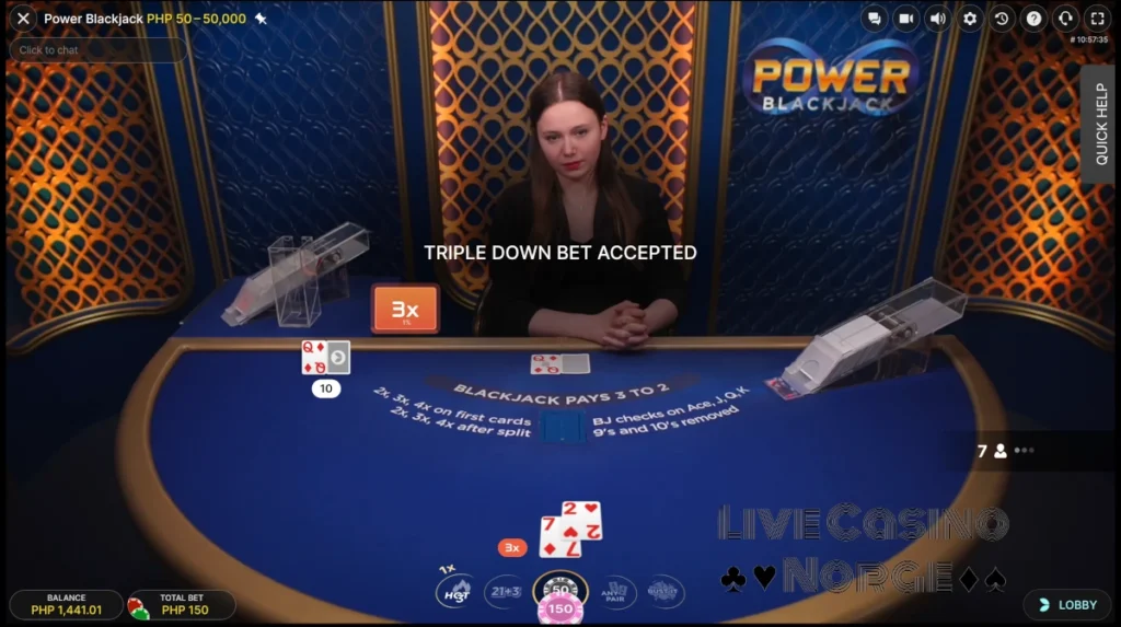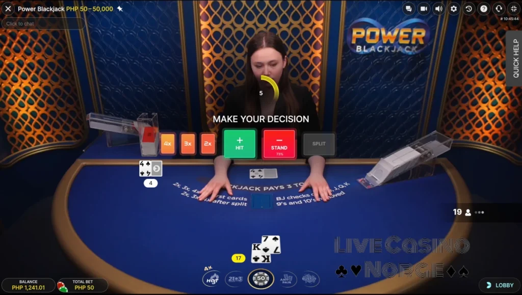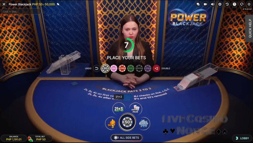 Power Blackjack fra Evolution Gaming omdefinerer blackjackopplevelsen med sine unike funksjoner og innovative spillmekanikk. Muligheten til å multiplisere innsatser gir blackjack-entusiaster en ny utfordring og lokker dem til å skjerpe strategiene sine i forhold til de vanlige blackjack-spillene.