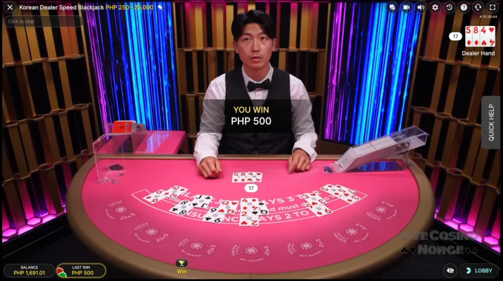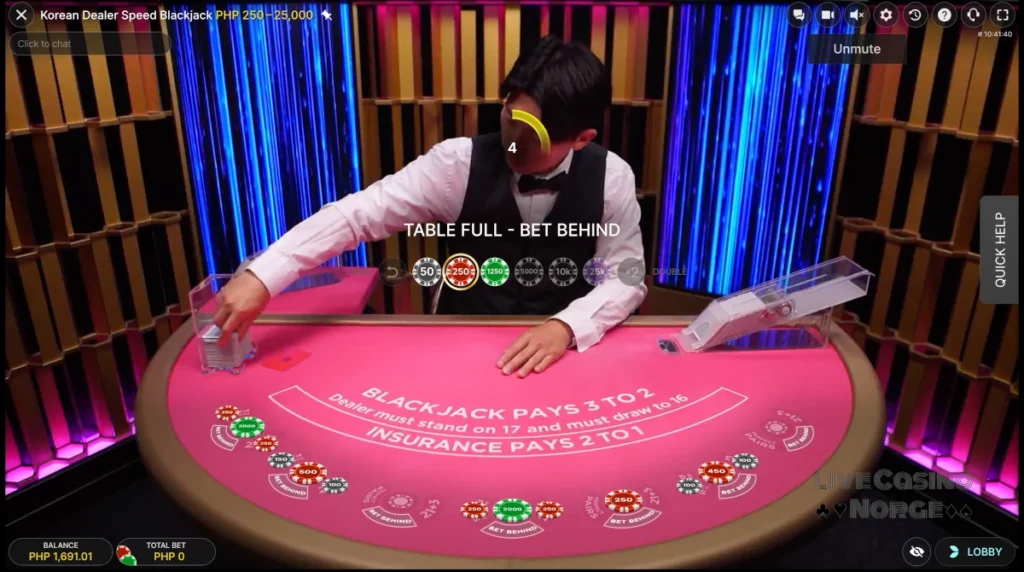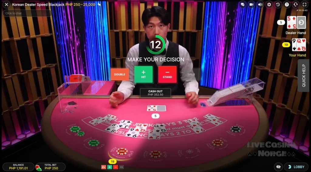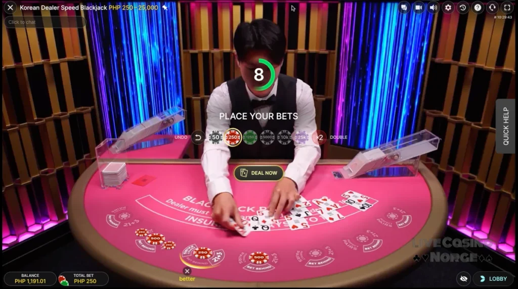 Speed Blackjack bruker kjerneprinsippene i det tradisjonelle blackjack-spillet, samtidig som det byr på innovasjoner som øker engasjementet og spenningen. I dette spillet tar alle spillerne sine beslutninger samtidig, noe som betyr at du må handle raskt og sikkert for å kunne dra nytte av denne funksjonen.