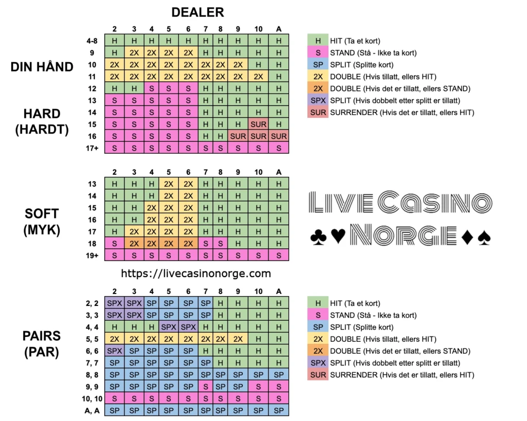 Hvis du er klar til å ta blackjack-opplevelsen din til et nytt nivå, får du her en enkel og lettfattelig guide som kan hjelpe deg med å skjerpe ferdighetene dine og hjelpe deg med å vite når du skal ta kort, stå, splitte eller doble i blackjack.
