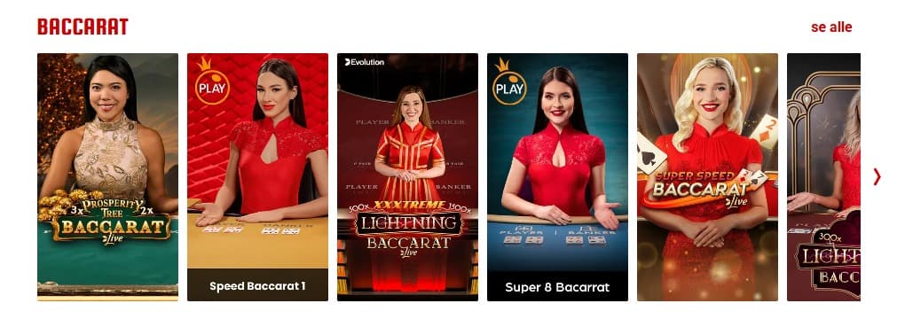 - Baccarat: Et enkelt, men spennende kortspill som får en ekstra fordel takket være raske runder og muligheten til å satse på bankmannens hånd, spillerens hånd eller uavgjort.