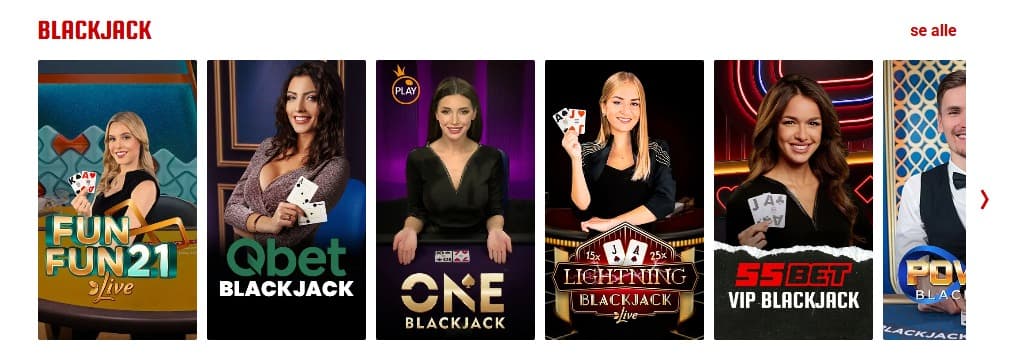 - Blackjack: Et bredt utvalg av bord med ulike innsatsnivåer, profesjonelle dealere og muligheten til å chatte i sanntid.
