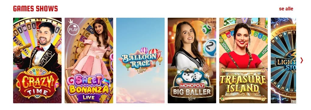 Her finner du klassiske bord som Blackjack, Roulette og Baccarat, men også spesialiserte varianter som Speed Baccarat, Lightning Roulette og Infinite Blackjack. I tillegg finnes det populære Game Shows, som Crazy Time og Monopoly Live, for de som ønsker en mer underholdende og showaktig opplevelse.