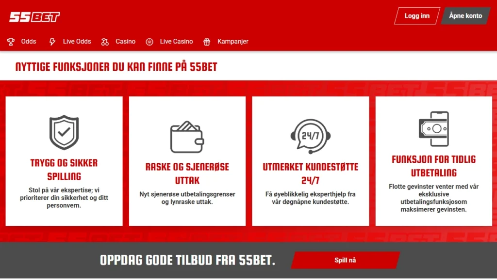 Hva som gjør 55Bet unike på det norske markedet, er deres cashback-tilbud. Denne kampanjen er gyldig inntil videre og tilbyr spillere hos 55Bet en cashback-bonus på 55%. Pengene fra cashbacken kan tas ut hver dag, så mange ganger du vil (maks kr 5.000 om gangen), og alle pengene fra cashbacken kommer uten omsetningskrav. Den slår alle andre norske cashback-bonuser og er den beste på markedet akkurat nå!