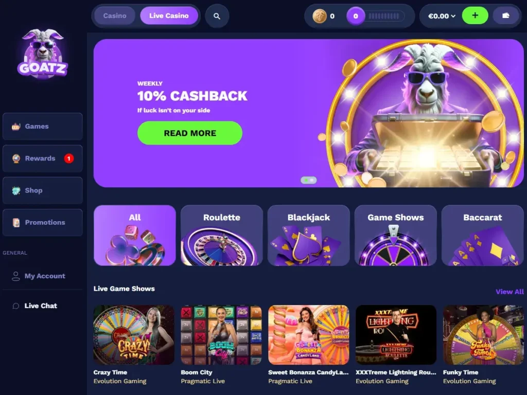 Goatz Casino leverer en live casino-opplevelse i toppklasse, med stort spillutvalg, trygge betalinger og innovative bonuser. For norske spillere som elsker Game Shows og klassiske bordspill med ekte dealere, er dette et nytt casino som virkelig er verdt å prøve i 2025.
