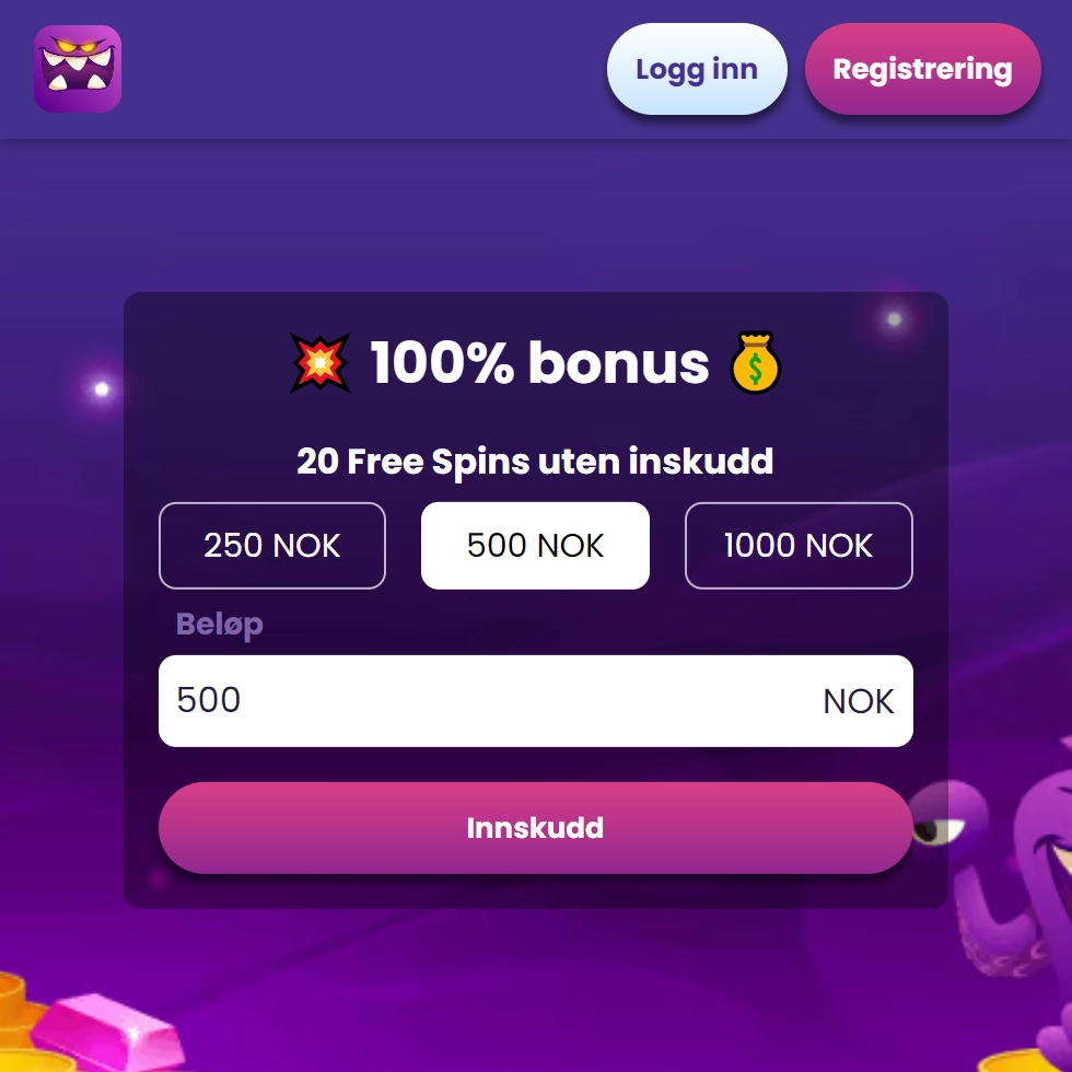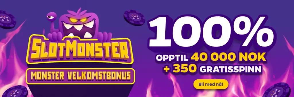 Hos Slotmonster blir umiddelbart belønnet med 350 gratisspinn ved innskudd på Fire Joker. Og ved ditt første innskudd venter en bonus på 100% opptil 40000 NOK som du kan satse på live kasinospill, noe som gjør slotmonsters bonus til en ekte live casinobonus. Omsetningskravene som gjelder for innskuddsbonusen er 35 ganger på det innskuddsbeløpet og bonusen. Eventuelle gevinster fra gratissnurr må også omsettes 35 ganger.