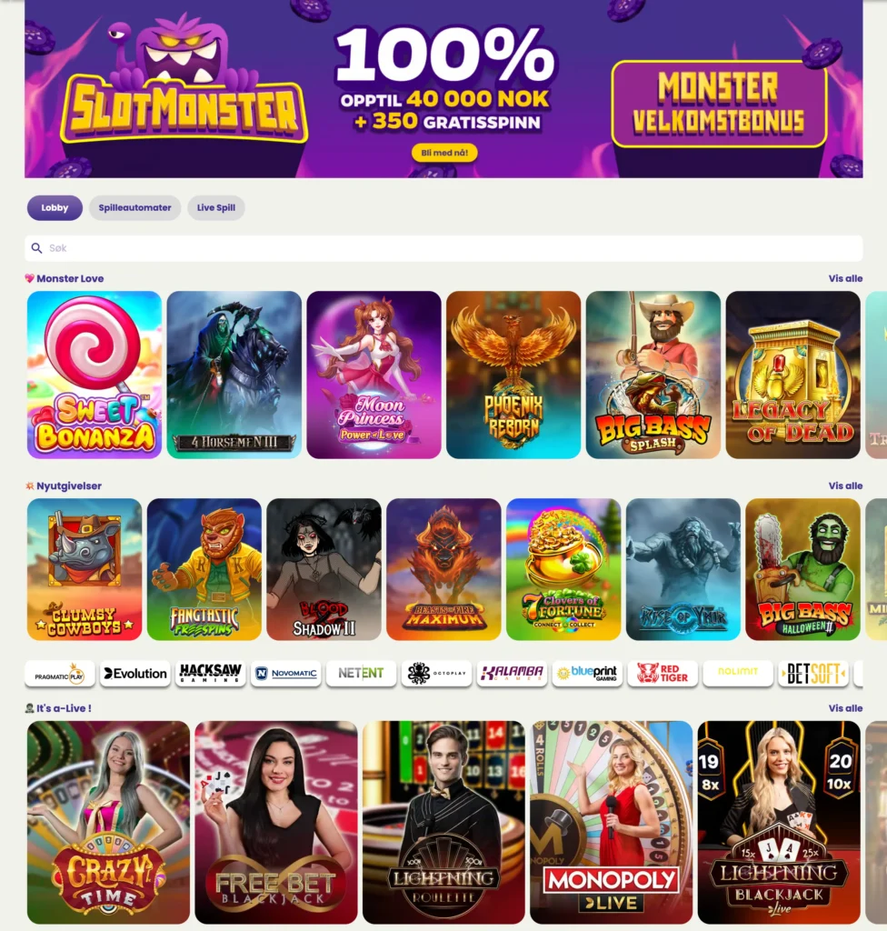 Som en velkomstgave, tilbyr Slotmonster 100% opptil 40000 kr i bonus og 350 gratisspinn ved innskudd på den populære spilleautomaten Fire Joker og 20 gratisspinn uten innskudd ved registrering på den populære spilleautomaten Sweet Bonanza som gir nye spillere en flygende start på deres casinoeventyr. Bli med for en førsteklasses live spillopplevelse som kombinerer spenningen fra et landbasert casino med bekvemmeligheten av online spill.