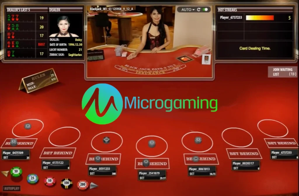 Microgaming har klassiske live casino-spill innen blackjack, roulette og baccarat, med flere kjente varianter fra eldre live casino-porteføljer.